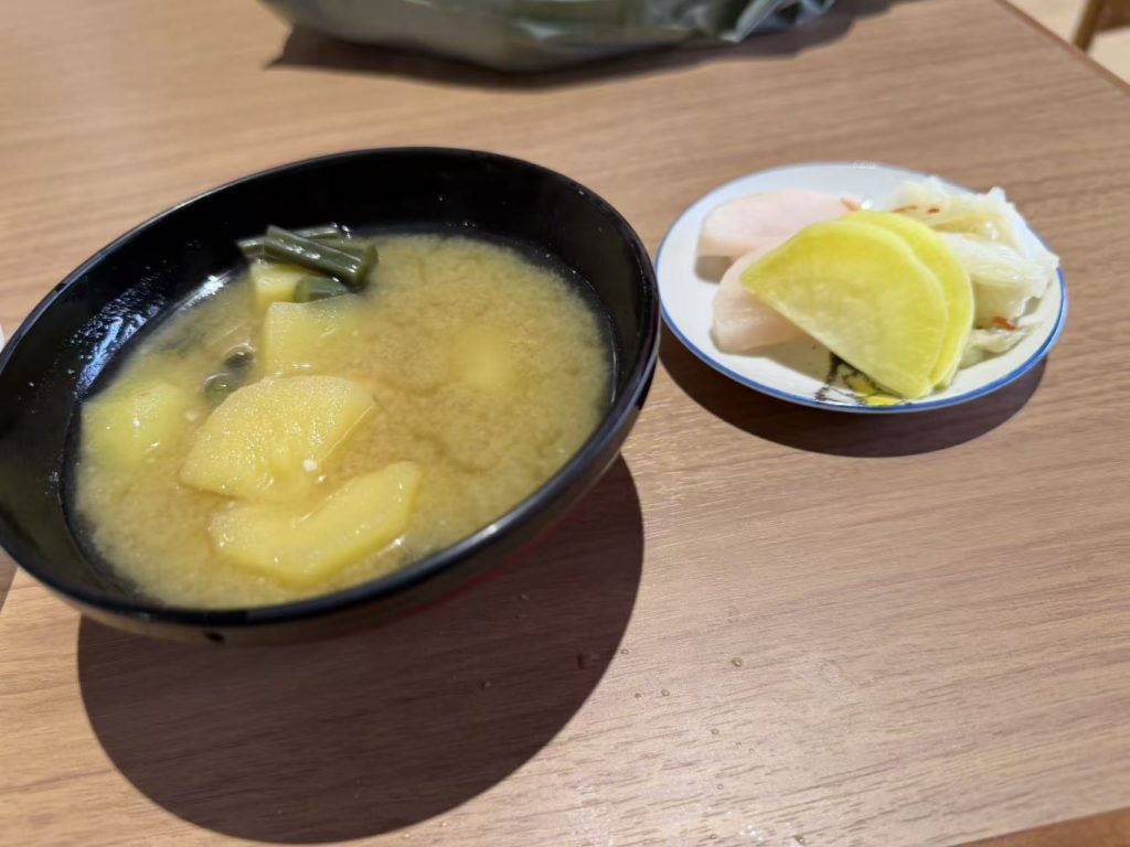 味噌汁150円。おばあちゃん方は大変親切で、おしんこをサービスしてくれた。