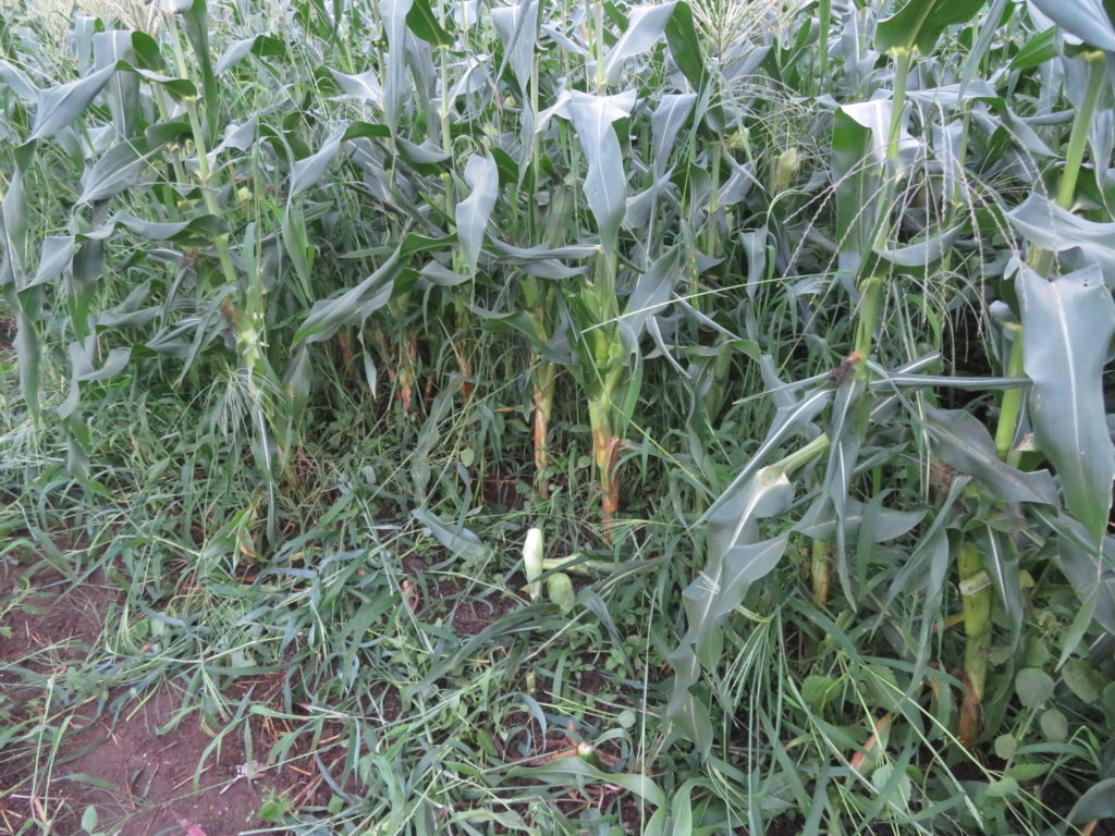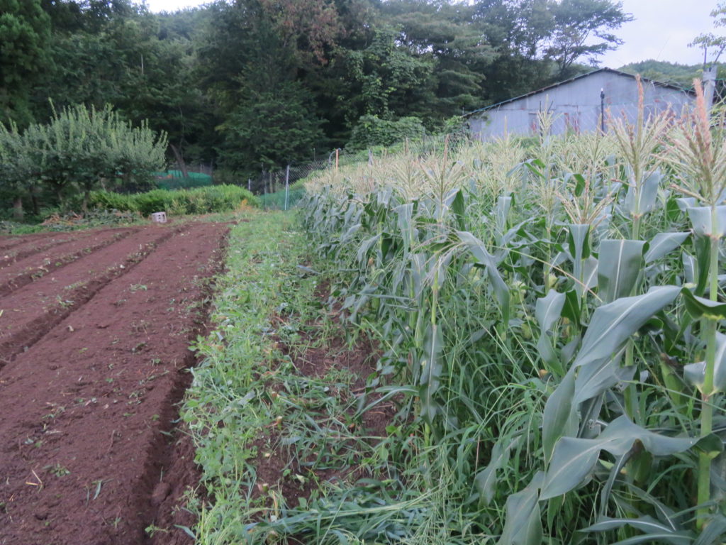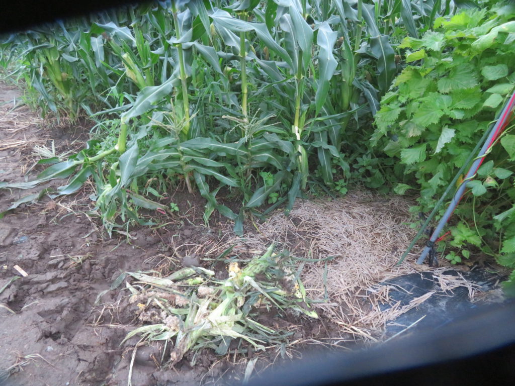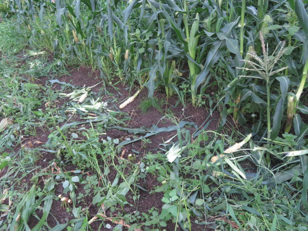 昨日、道路側の畑入り口から侵入したらしく畑手前のトウモロコシが喰われていた。