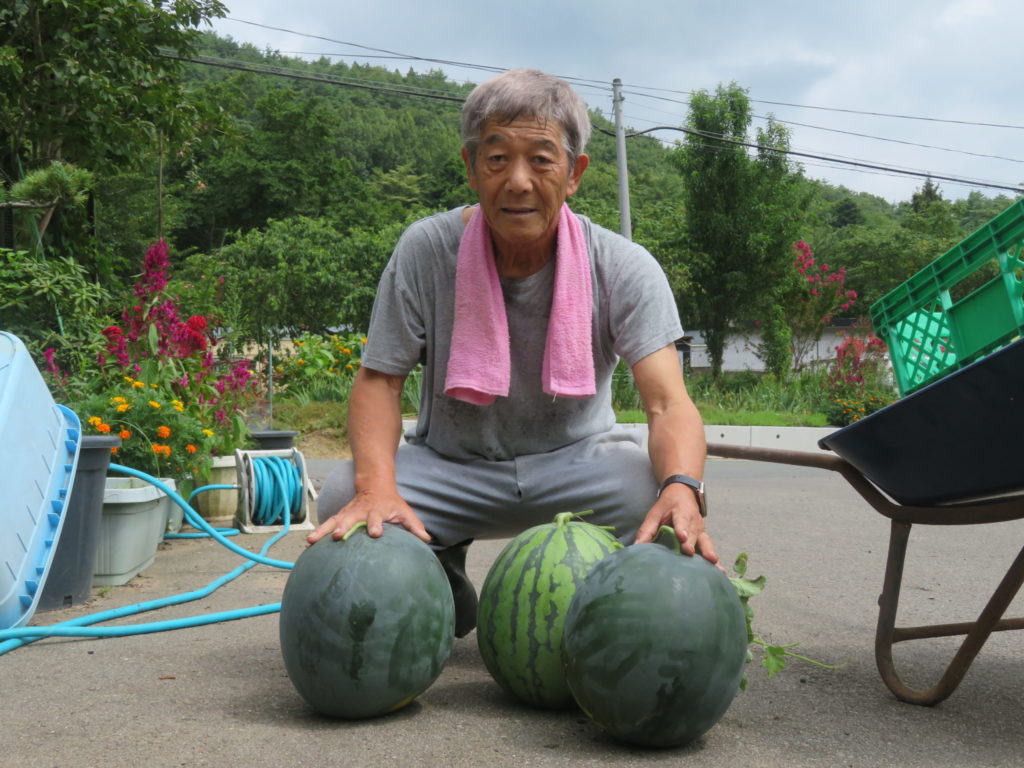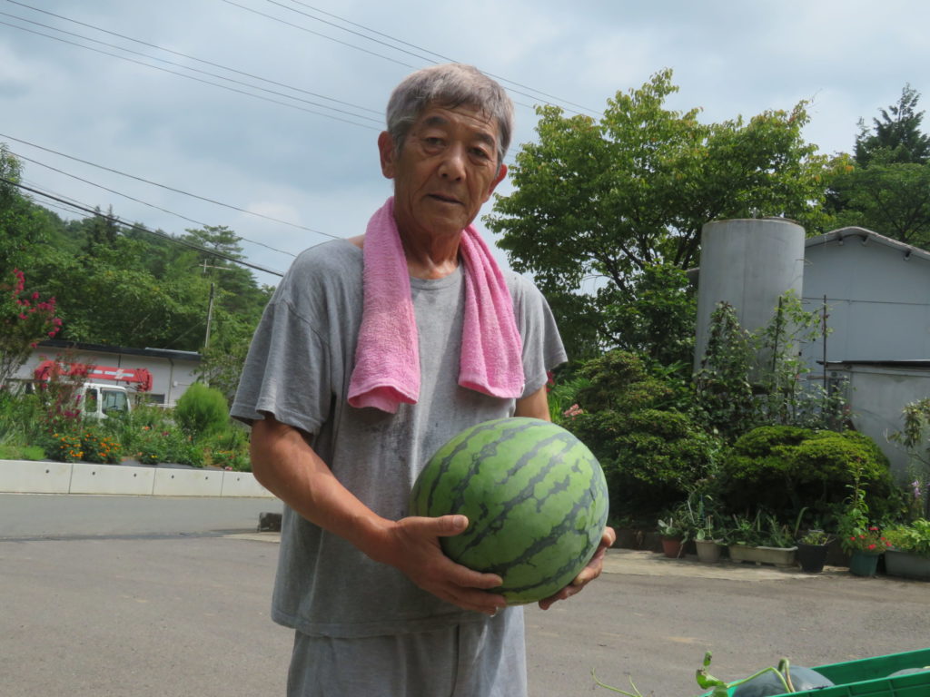 千葉社長に頂いた野菜の苗が今最盛期に収穫出来ていて特にスイカは大当たりだ。
