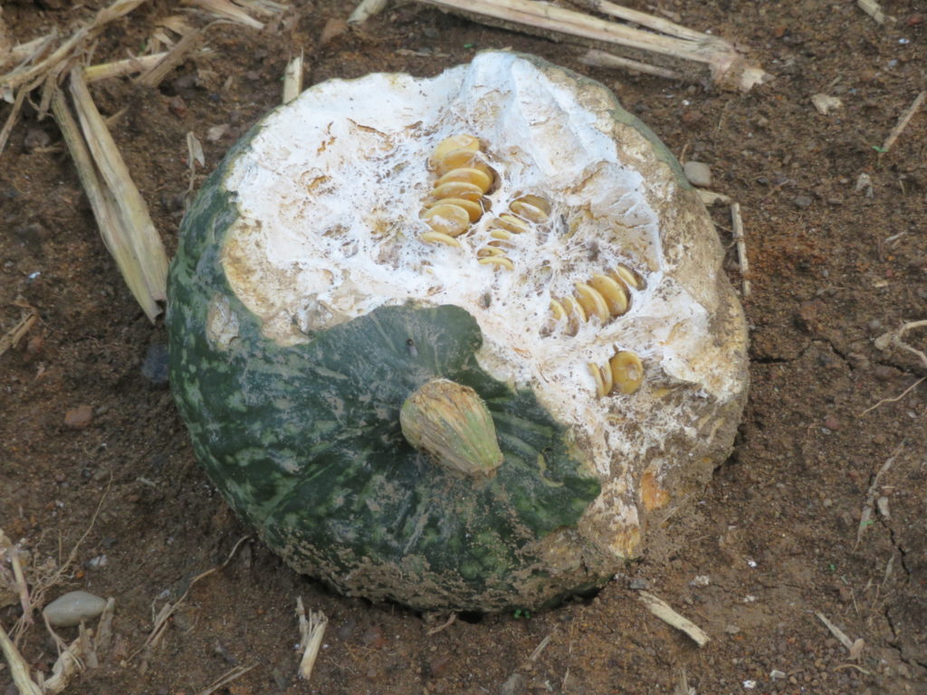 畑に転がっていた猿に喰われているカボチャ、こんなに硬いカボチャでも齧りつく馬鹿猿