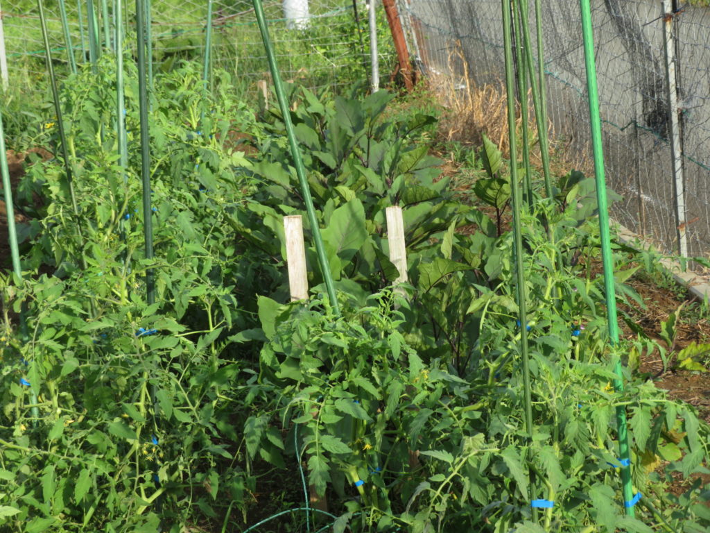 スイカとメロンは収穫を終えたが、今になってトマトとナスが勢いを増してきて実を付けていた。