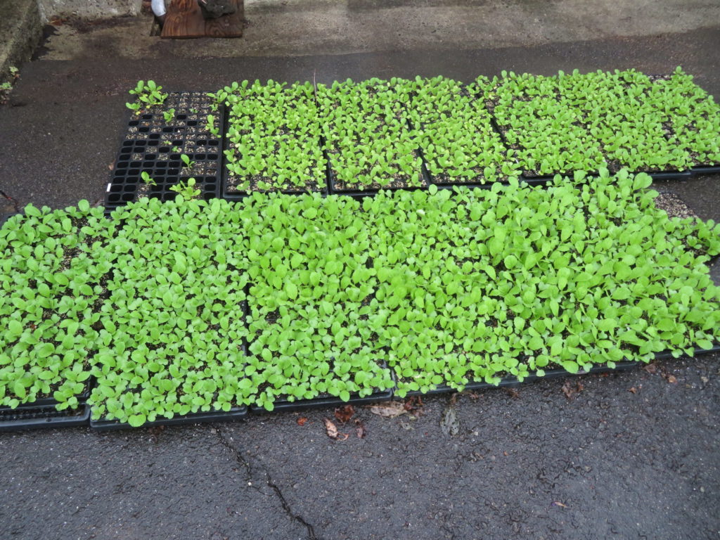 移植を待つ白菜の苗だが上の小さい苗は下の大きな苗より5日程度早く蒔いたのだが、品種の差によって成長頻度が大きく違いを現している。