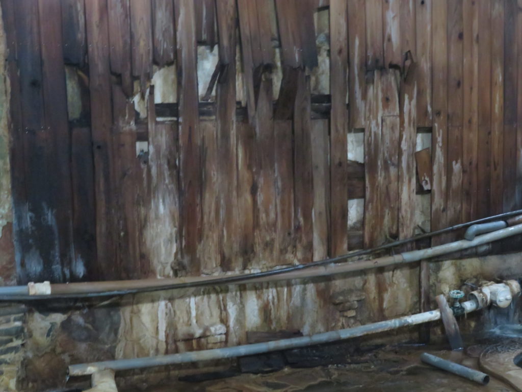 初代の経営者の手書きの素晴らしい文章の効能書きも天井いたが雨漏りでベニヤ板がめくれている。