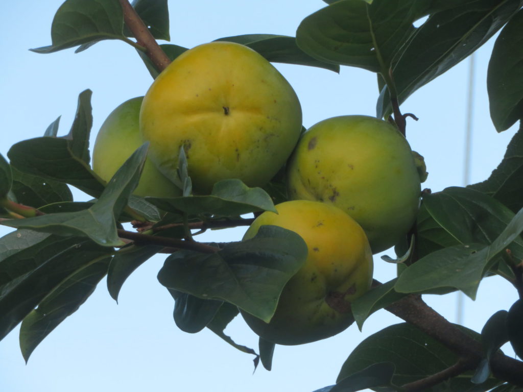 若干黄色みを帯びて来たので来月中旬には食べられそうだが、温暖化で玉野でも渋が抜けて甘くて美味しい柿の栽培が可能に成る筈。
