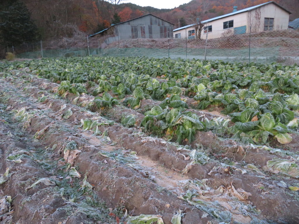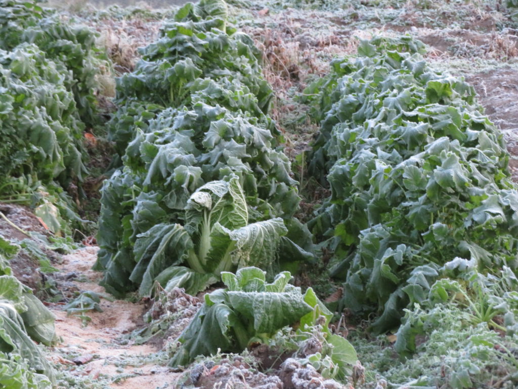 白菜にも霜が付いているが、凍る寸前に身を守るためにデンプンを蓄えるので甘い白菜や大根になるのだ。