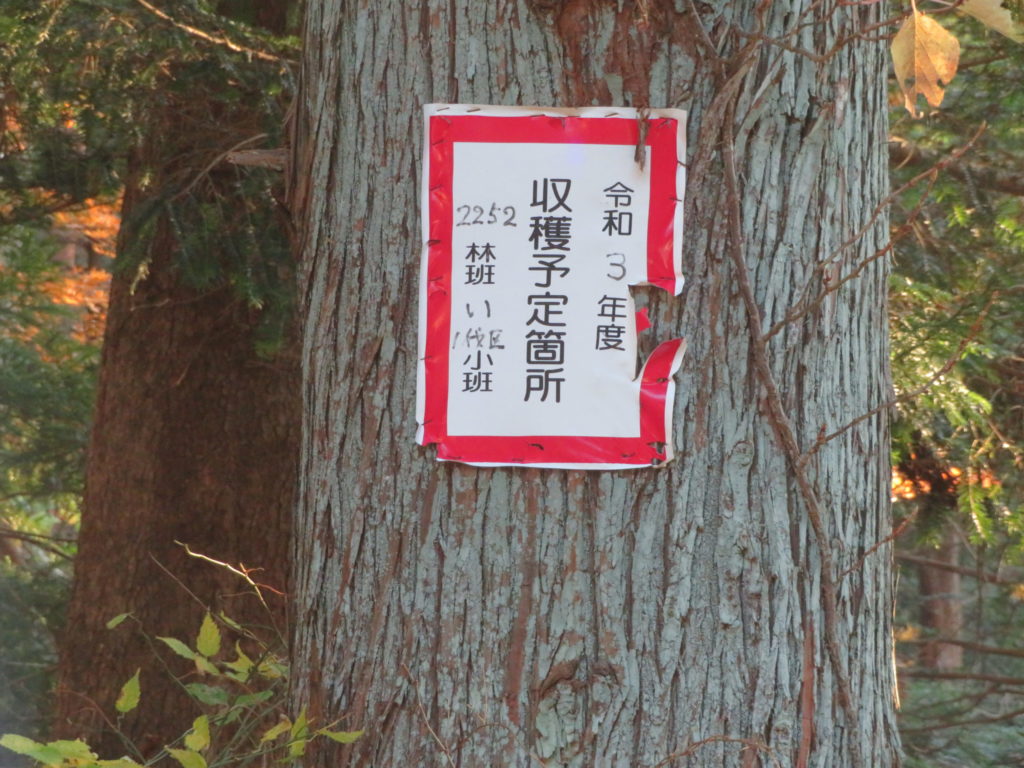 収穫予定の看板が出ていたが、営林署直轄での作業は行われなくなり落札業者に売られているので伐期が数年遅れている。