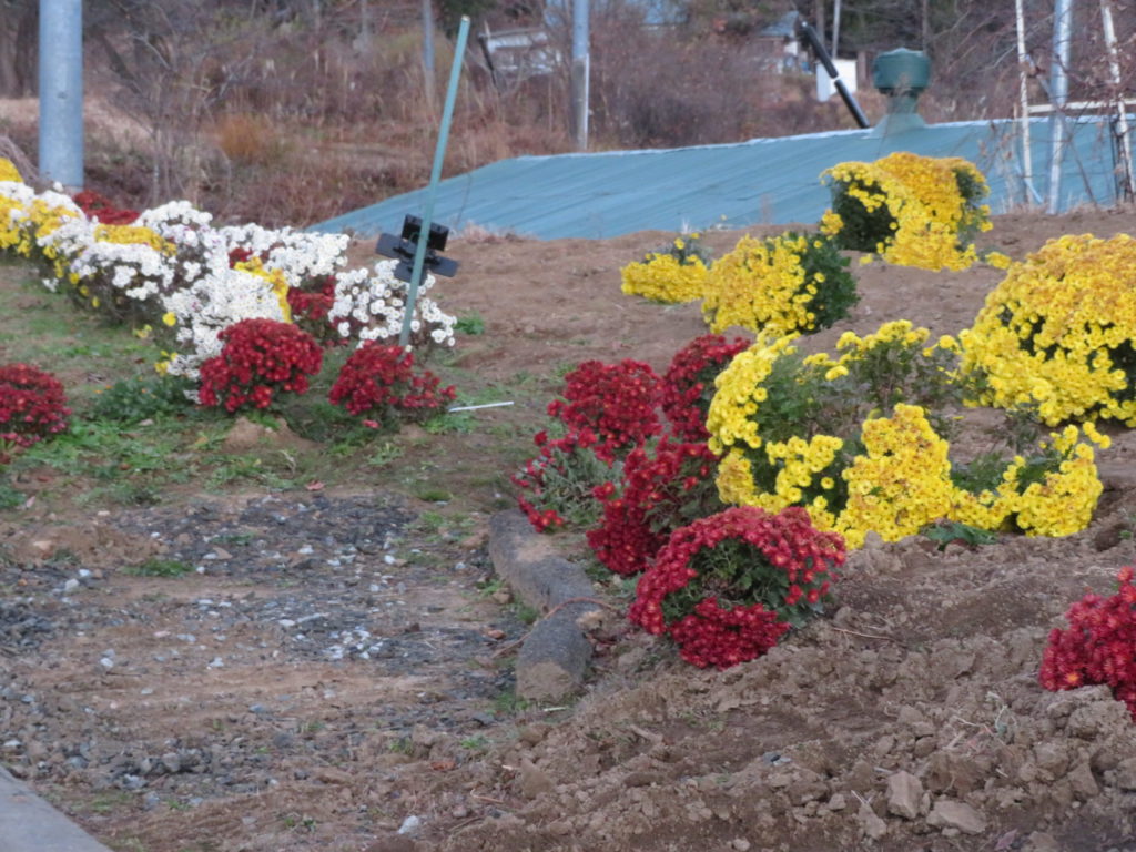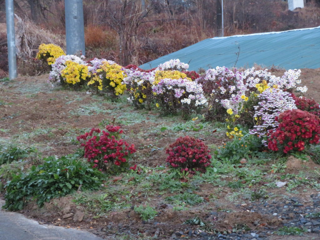 寒々とした景観の中に色濃いザル菊が目立つ。