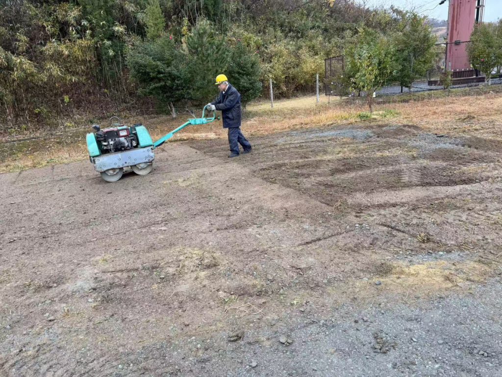 ホイールローダーで敷き詰めて工事用に業者が搬入していた振動ローラーを借りて転圧