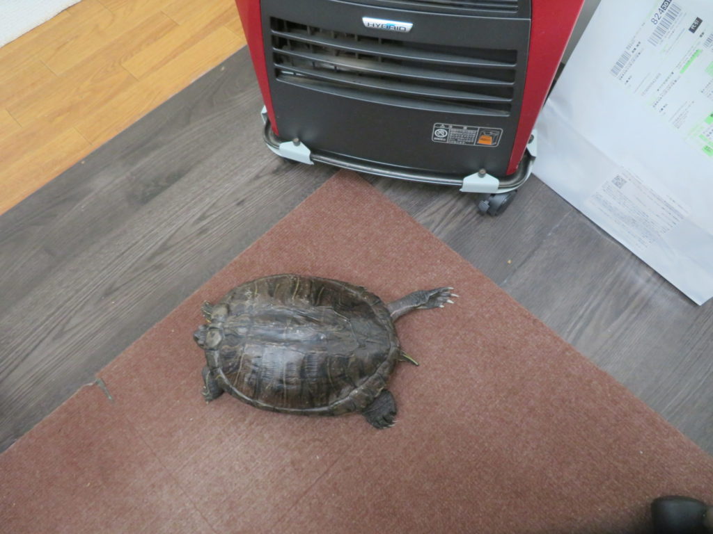 メカ子ちゃんは、暖を執るのにファンヒーターの前で後ろ足をデレーッと伸ばし切って安心のポーズだ。