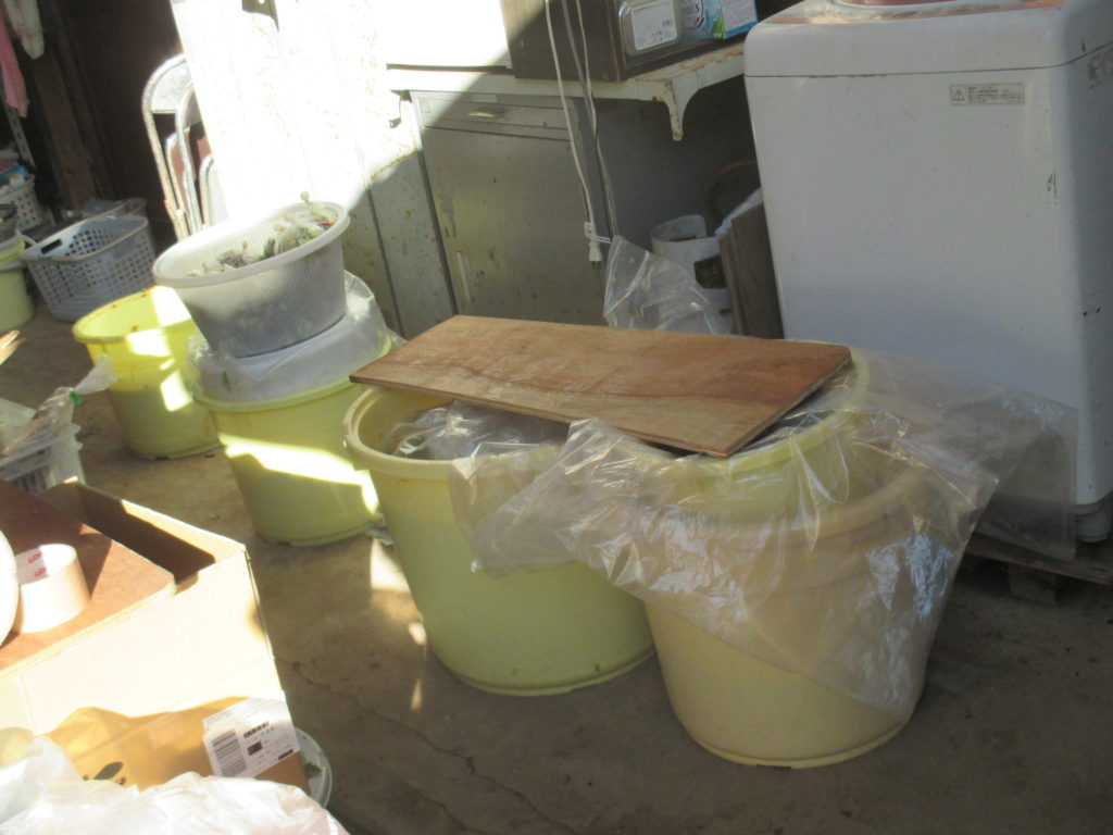 大量に白菜が有ったのでビニール袋の上に私が載って踏みつけて重し代わりに圧縮してその後普段の重しを載せて現在水が上がって来るのを待つている。