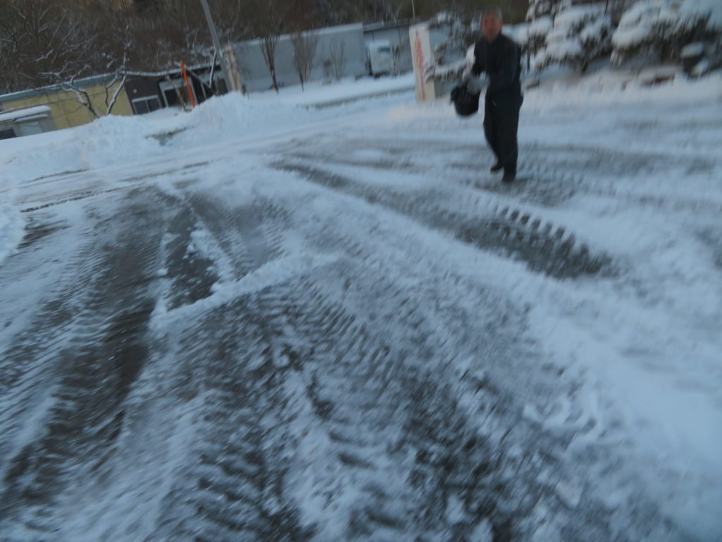 除雪後に融雪剤を撒いてフォークリフトが走れるように路面の管理も大事だ。