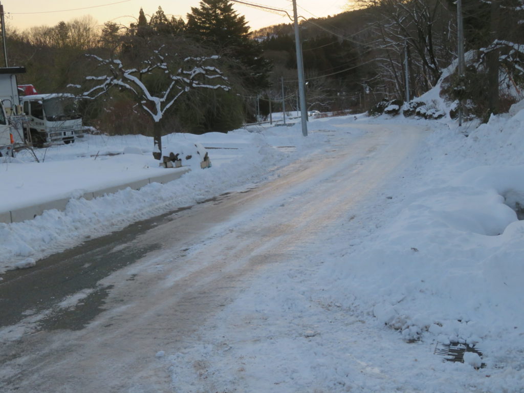 昨日の大雪の影響で日陰には凍て付いたアイスバーンになっていて滑るので危険