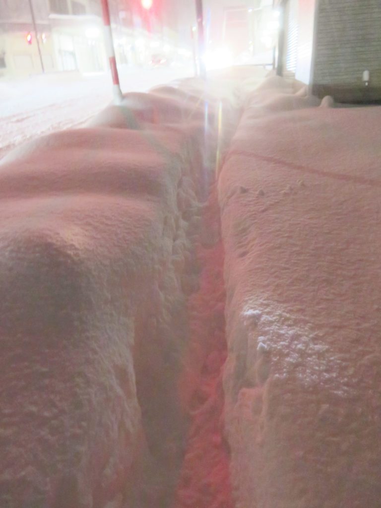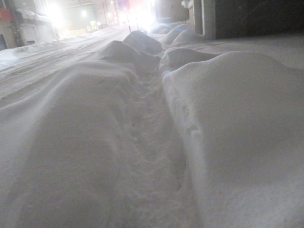 歩道の雪が踏み固まっていて、少しでも脇に踏み外すと膝まで雪に埋もれてしまうので地酒で酔った足取りでも慎重にすすんだ。