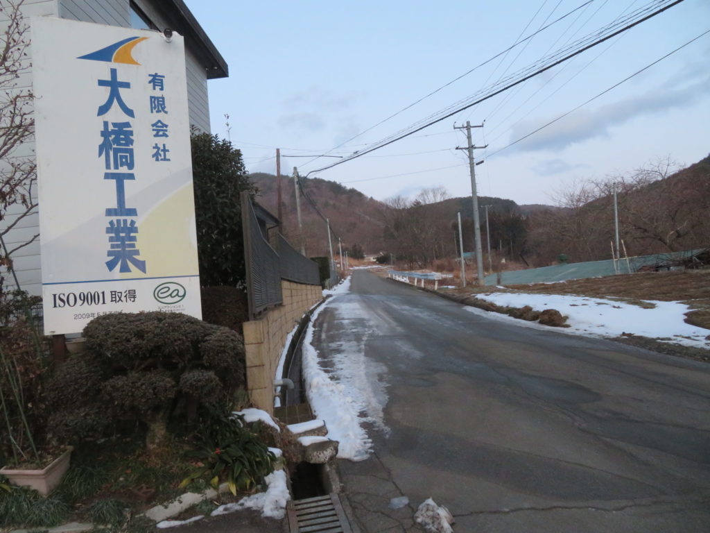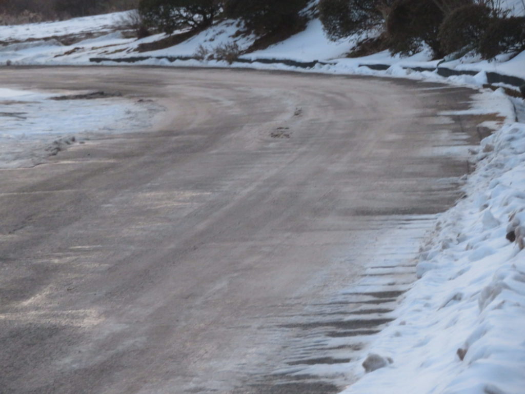 温かかった昨日、日陰の道路の凍て付いた圧雪をホイールローダーで削ったので危険な路面の状態が無くなっている。