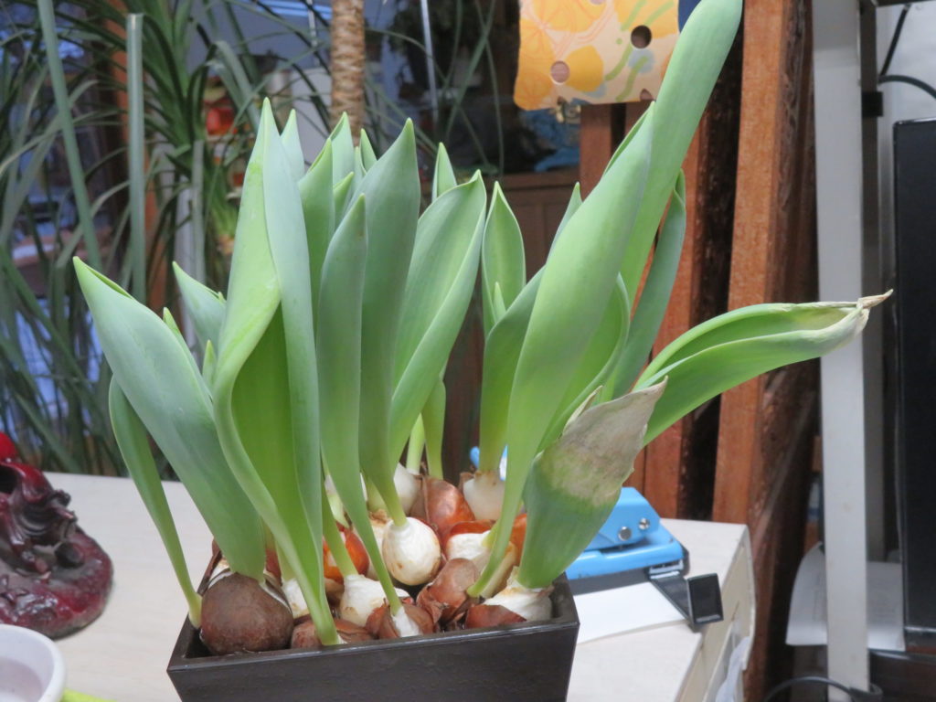 真ん中にチューリップの花芽が伸びて来ている。