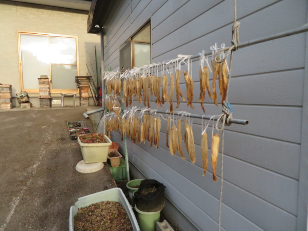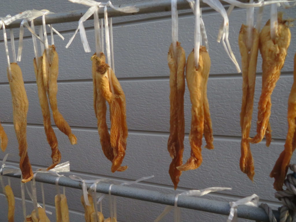 大根の水分が凍って寒風にさらされて乾燥して行くのだが、連日の異常な高温によって凍らない日が続いていて、温かい空気にさらされての乾燥なので上の方は白くフワッと仕上がっているが、下の方は水分が一気に乾燥してしまって黒く硬い凍みダイコンになってしまっている。