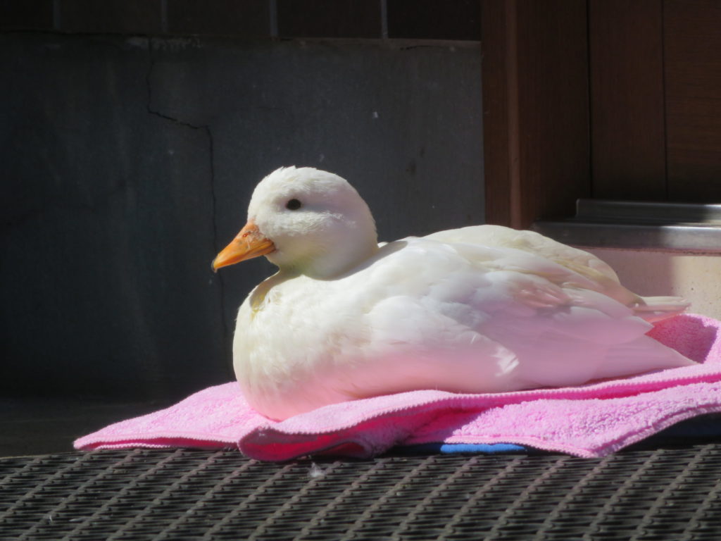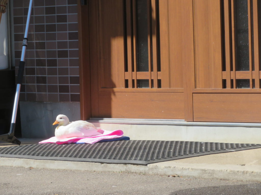 事務所から引っ越ししてからは我が家の玄関がお気に入りの場所になっていて、番犬ならぬ番ダックだ。