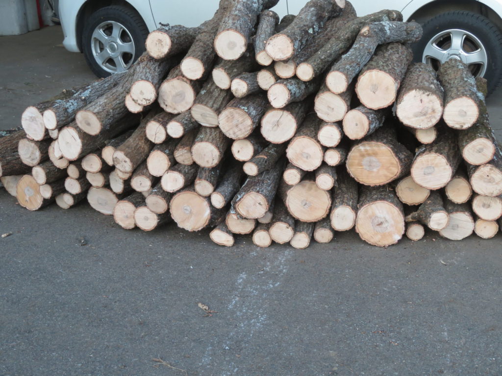 昨日、山からシイタケを植えるクヌギの木の原木を伐採して90センチの輪切りにしてホイールローダーで運んで来た・・・。