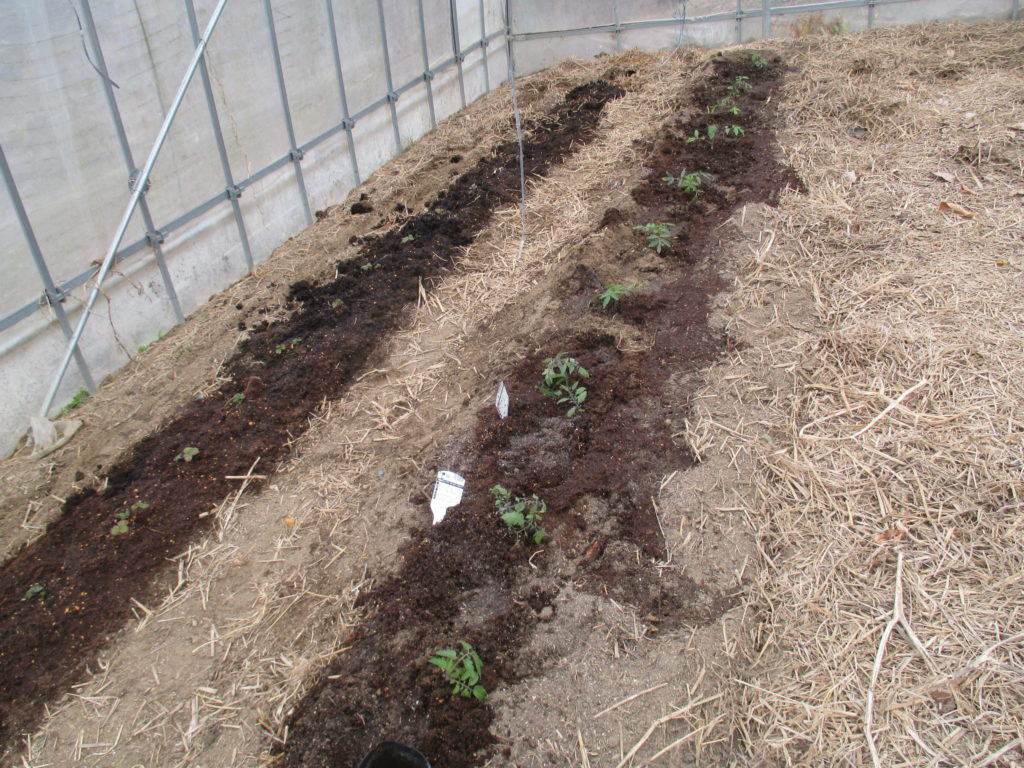 土壌が汚染されている可能性が有るので、バーク堆肥と野菜用の倍土を買って来て敷き詰め、その上にトマト4種類とイチゴ苗も昨年ポットに植えていたのを定植して早撮りイチゴの栽培にチャレンジだ。